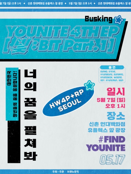 3일 0시 유나이트는 공식 SNS 채널들을 통해 4TH EP '빛 : BIT Part.1'의 오프라인 버스킹 ‘FIND YOUNITE(파인드 유나이트)’ 포스터를 깜짝 공개하며 버스킹 이벤트 소식을 전했는데, 포스터에는 이번 앨범 콘셉트에 맞게 2000년대 동아리 모집 포스터를 연상케 하는 레트로한 요소들이 담겨 있어 팬들의 기대감을 높였다.